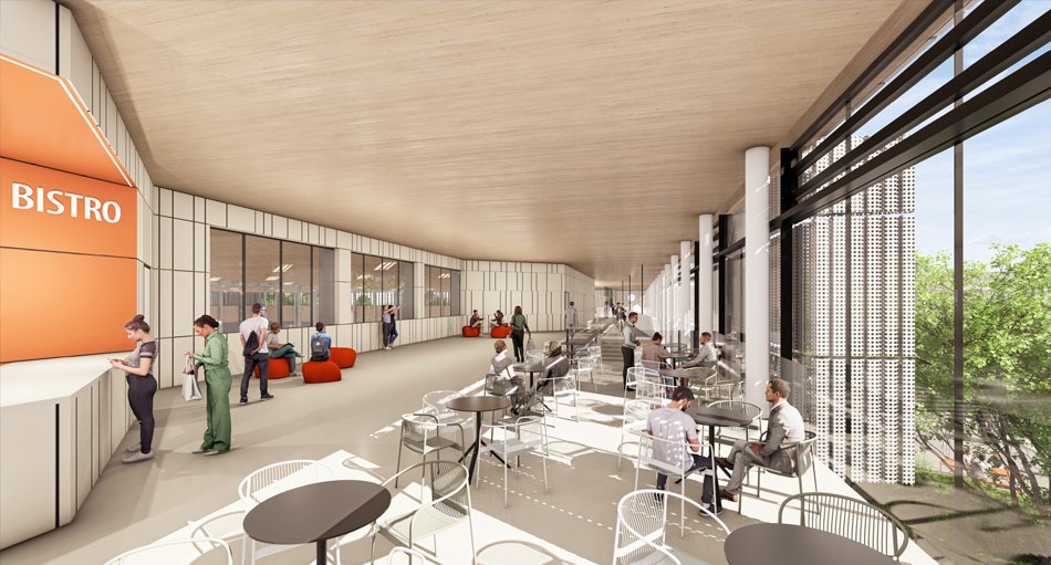 Nachhaltigkeit zieht sich wie ein roter Faden durch das gesamte Projekt. Die Halle erfüllt den Niedrigstenergiestandard, wird über Fernwärme beheizt und über Grundwasser gekühlt. Dreifachverglasung, LED-Beleuchtung und eine bereits geplante Photovoltaikanlage unterstreichen den energieeffizienten Anspruch. Holz als tragendes Gestaltungselement, kombiniert mit Metallelementen und Lochblech-Sonnenschutz, verleiht der Halle ein modernes Erscheinungsbild. Dank Holzwolle-Akustikplatten und einem bewusst in Schwarzgrau gehaltenen Innenraum entsteht eine zeitgemäße Atmosphäre, in der Messestände optimal zur Geltung kommen.